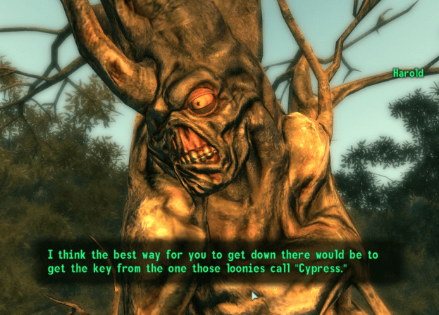 For instance: at one point in the game, you discover a small “oasis” of trees and plant life in the middle of the desolate, apocalyptic wasteland.  A thriving community has been built around the oasis, and the inhabitants of this area seem to worship a large tree in the center of town.  Upon further investigation, you discover that the tree is actually a human who has been warped by radiation to have a tree growing OUT-OF-HIS-HEAD.