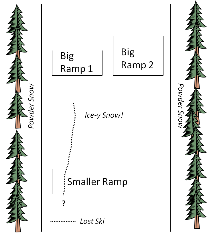 You see, what happened was… I bit it on the ice-y landing zone, and then my ski went down the hill, then up and over the smaller ramp, at which point I lost sight of it.  I ski’d on one-foot after it as soon as I got up, but when I got to the ramp it went over, it was gone.