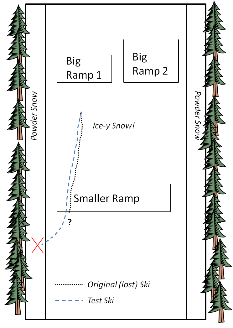 I then designed A TEST! I walked back up the hill to the point at which I ever-so-gracefully bit-the-proverbial-dust, and gently shoved my remaining ski down the hill, in relatively the same path I had seen my lost ski follow.  My first attempt was too weak, as it didn’t even make it over the next ramp, so I tried again, and this time I put a little mustard on it…