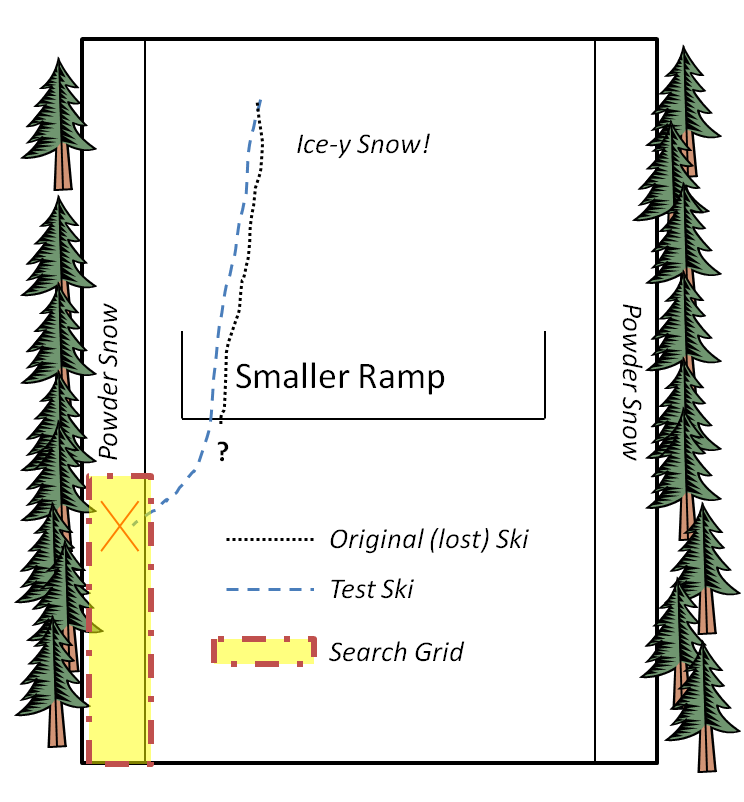 So now I knew approximately how the lost ski probably behaved after it went over the ramp.  The only thing which would have made a difference is how fast the original lost ski was travelling.  So I started a search-grid in the powder, approximately 8 feet by 30 feet, and started digging.
